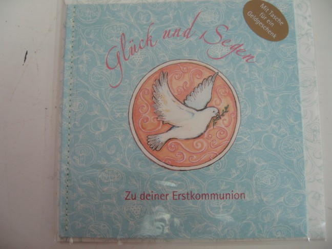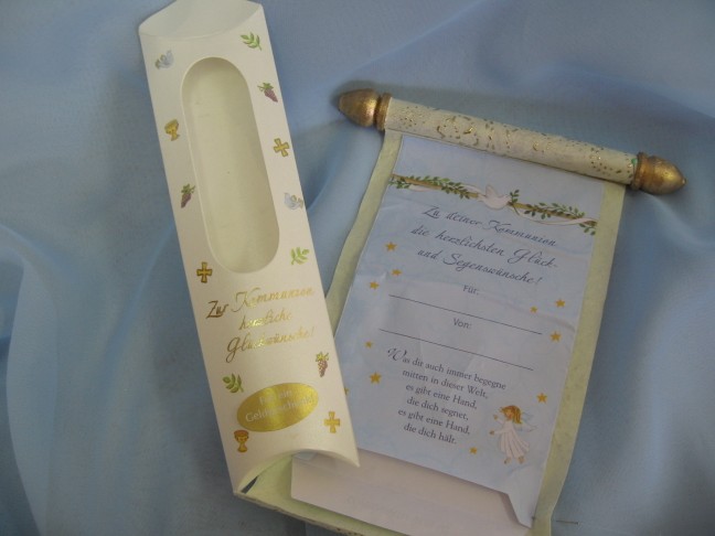 | | E5:Zur Kommunion: Schmuckrolle mit Glückwunsch, Segensspruch und Kuvert für ein Geldgeschenk € 4,50 |
