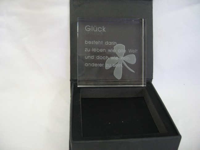 | | E13:Quader "Glück" aus Glas, als Briefbeschwerer verwendbar, 7,5x7,5cm, € 13,20 |